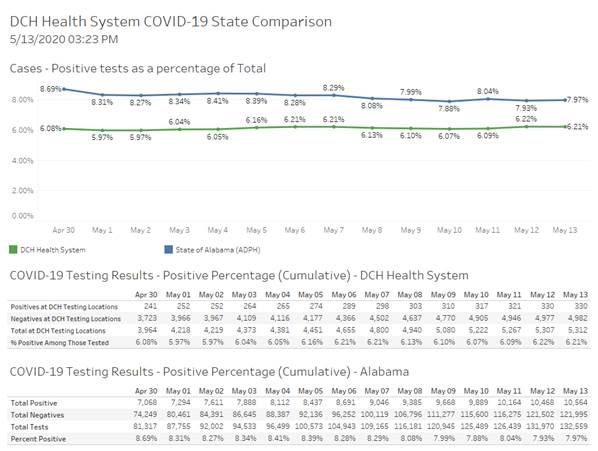 Also included is a chart showing the percent positive among those tested at DCH locations. This chart reflects totals by the end of each day (except today).