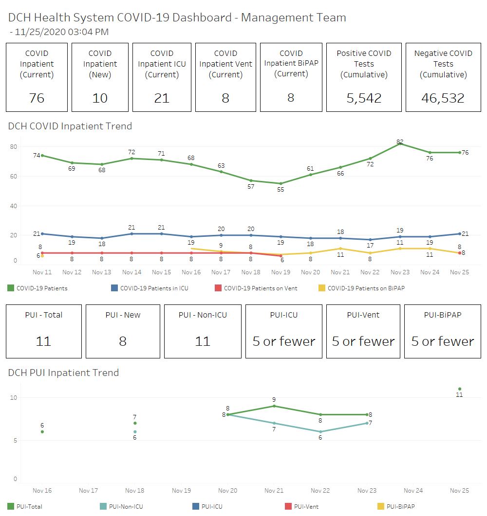 - 5,542 (cumulative) positive COVID-19 at DCH sites. These individuals are not necessarily in the hospital.