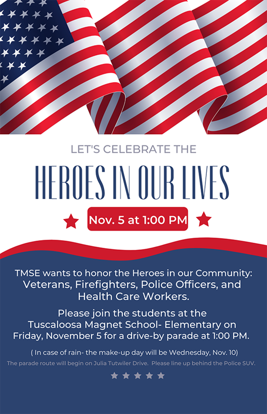 Next Friday, Nov. 5, the students at Tuscaloosa Magnet School-Elementary will honor and celebrate the "Heroes In Our Lives" with a drive-by parade for veterans, firefighters, police officers, and health care workers.