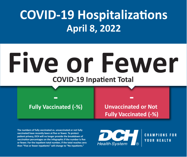 - Five or fewer inpatients within the DCH system who are positive for COVID-19.