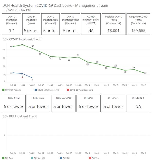 DCH Health System internal counts as of 3:47 p.m. on 3/7/22: